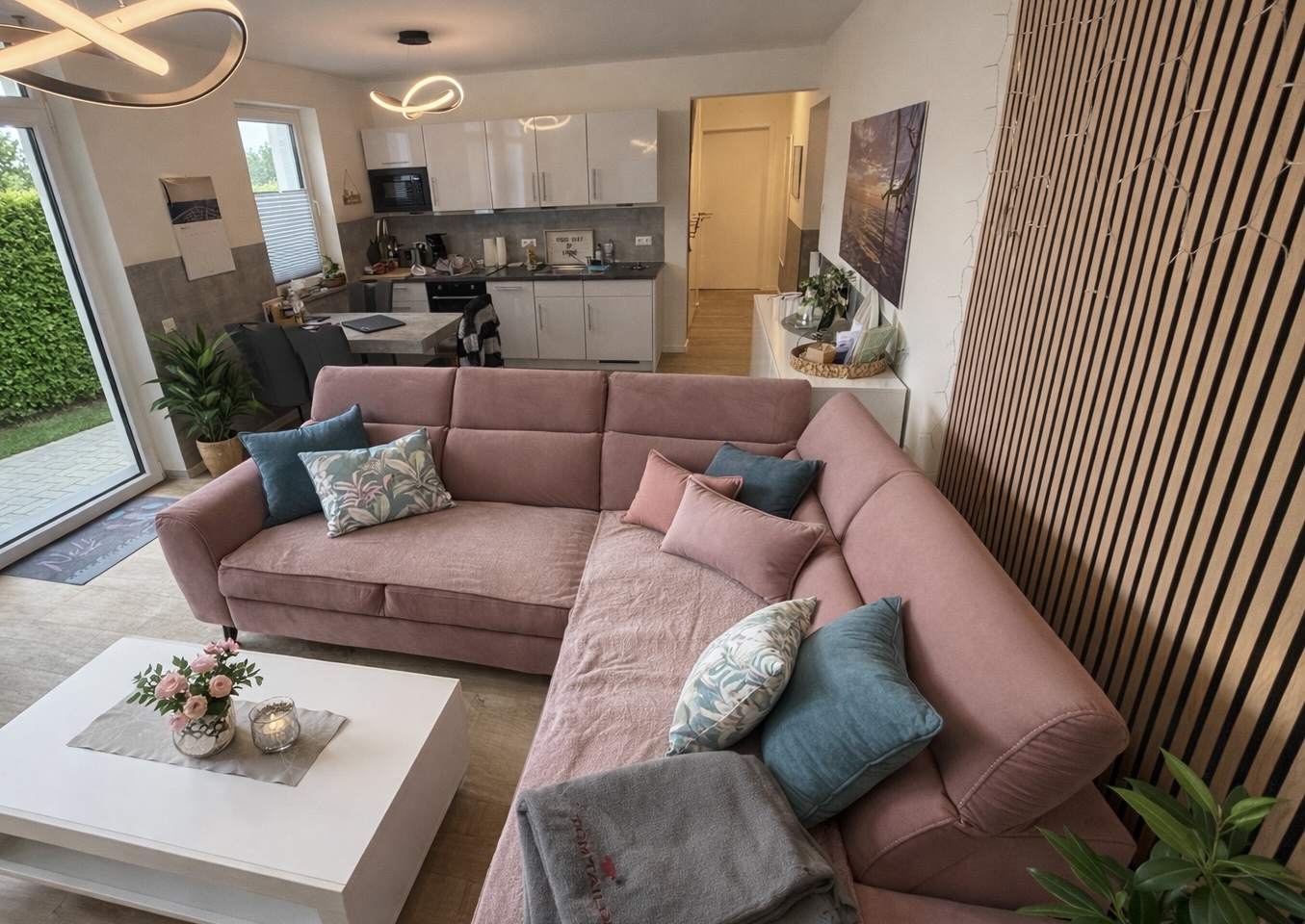 Das offene Wohnkonzept verbindet eine hochwertige, voll ausgestattete Küche mit einem einladenden Wohnbereich. Hier entsteht eine angenehme Atmosphäre für gemeinsames Kochen, Entspannen und Genießen.
