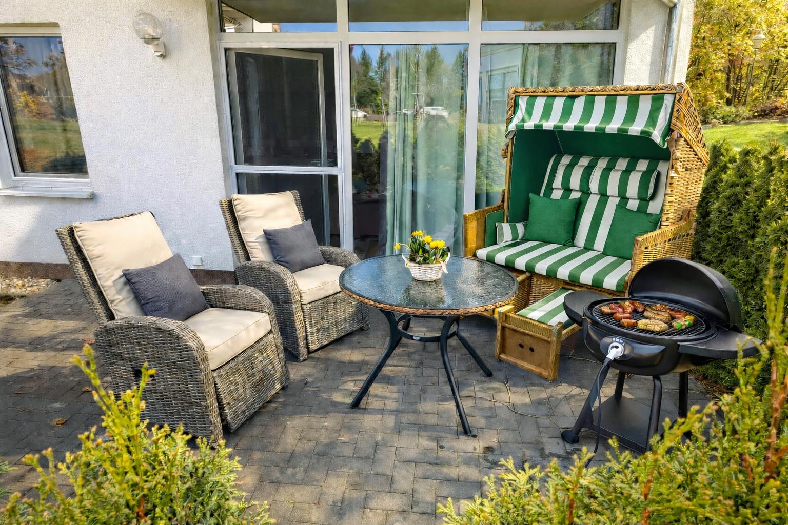 Die großzügige Terrasse mit angrenzender Grünfläche bietet Ihnen zusätzlichen Raum zum Entspannen. Hochwertige Loungemöbel und Sonnenliegen laden dazu ein, die Ruhe zu genießen und den Tag entspannt ausklingen zu lassen.